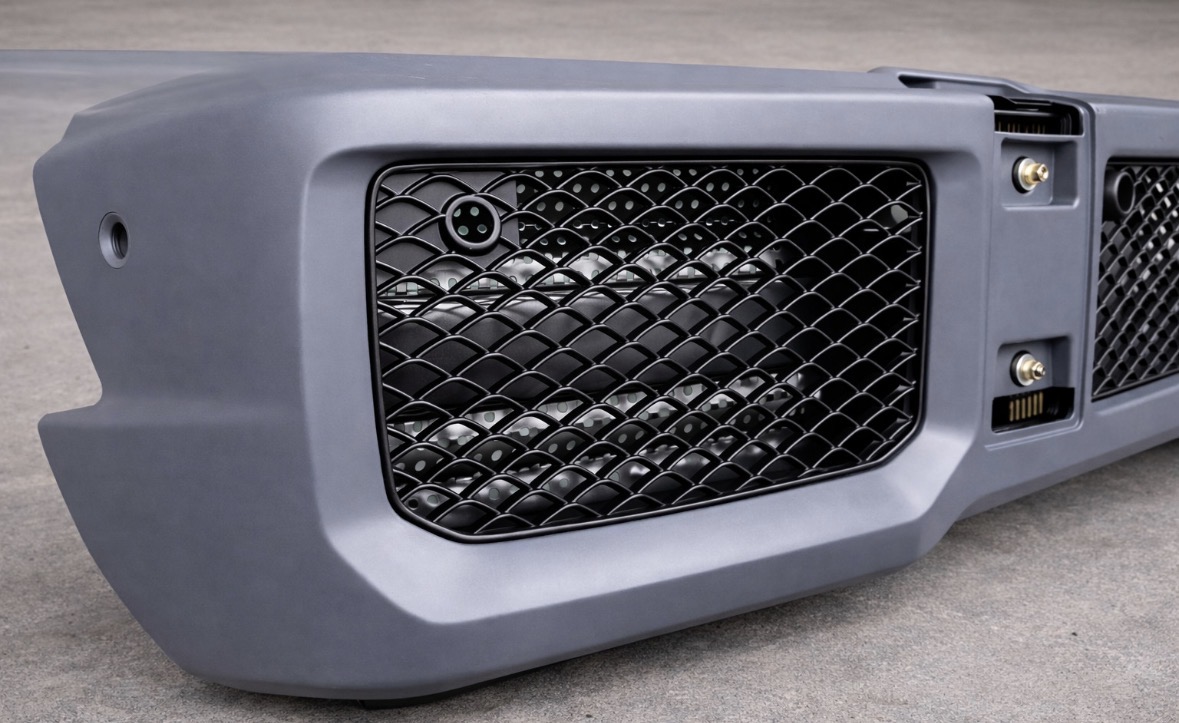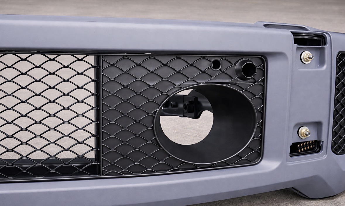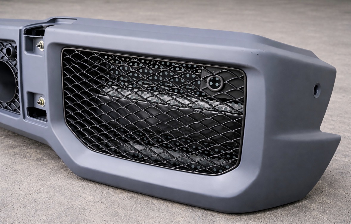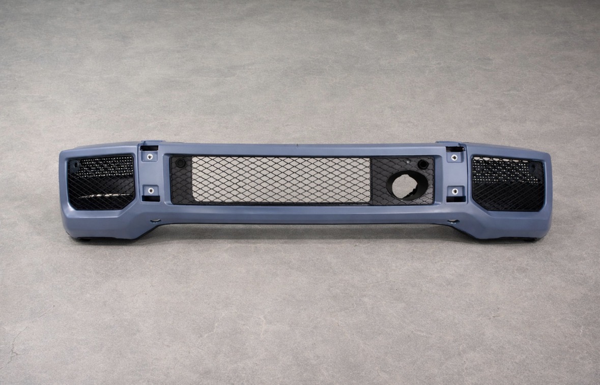 AMG G63-style front bumper designed to convert and upgrade your W463 Mercedes G-Class toward a later facelift look while maintaining OEM-style styling. Supplied in an unpainted, primed finish ready for preparation and paint to match your vehicle.